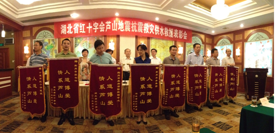 6月3日,湖北省紅十字會蘆山地震抗震救災(zāi)供水救援表彰會在武漢召開。表彰會上,荊門市供水總公司黨委書記陳永根作典型發(fā)言,荊門市供水總公司被授“情系蘆山 人道博愛”錦旗,參與供水救援的隊(duì)員彭華、黃洋獲得嘉獎,榮獲廬山地震抗震救災(zāi)先進(jìn)個人稱號。