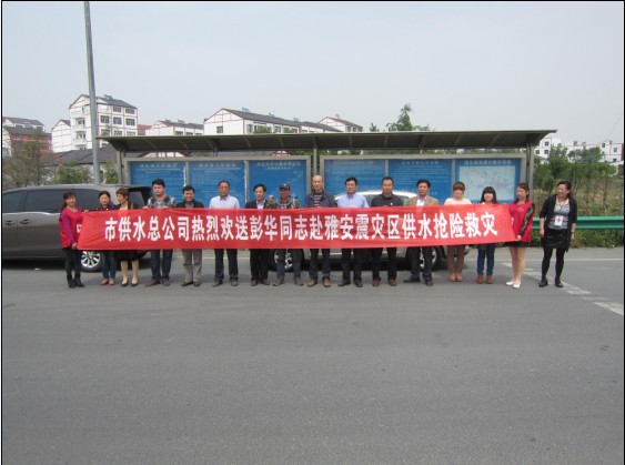4月25日,荊門(mén)市供水總公司黨委書(shū)記陳永根,副總經(jīng)理王宜龍等一行到荊門(mén)南高速路口歡送加壓站職工彭華隨湖北紅十字會(huì)12人供水救援隊(duì)赴雅安震災(zāi)區(qū)搶險(xiǎn)救災(zāi)。出發(fā)前,該司領(lǐng)導(dǎo)囑咐彭華在災(zāi)區(qū)注意自身安全;全力以赴的撲入到搶險(xiǎn)救災(zāi)工作中去;把全體供水職工“心系雅安,你我同在”的愛(ài)心帶去。彭華表示不辜負(fù)全體員工的囑托,把愛(ài)心帶到災(zāi)區(qū),并保證圓滿完成搶險(xiǎn)救災(zāi)任務(wù)。