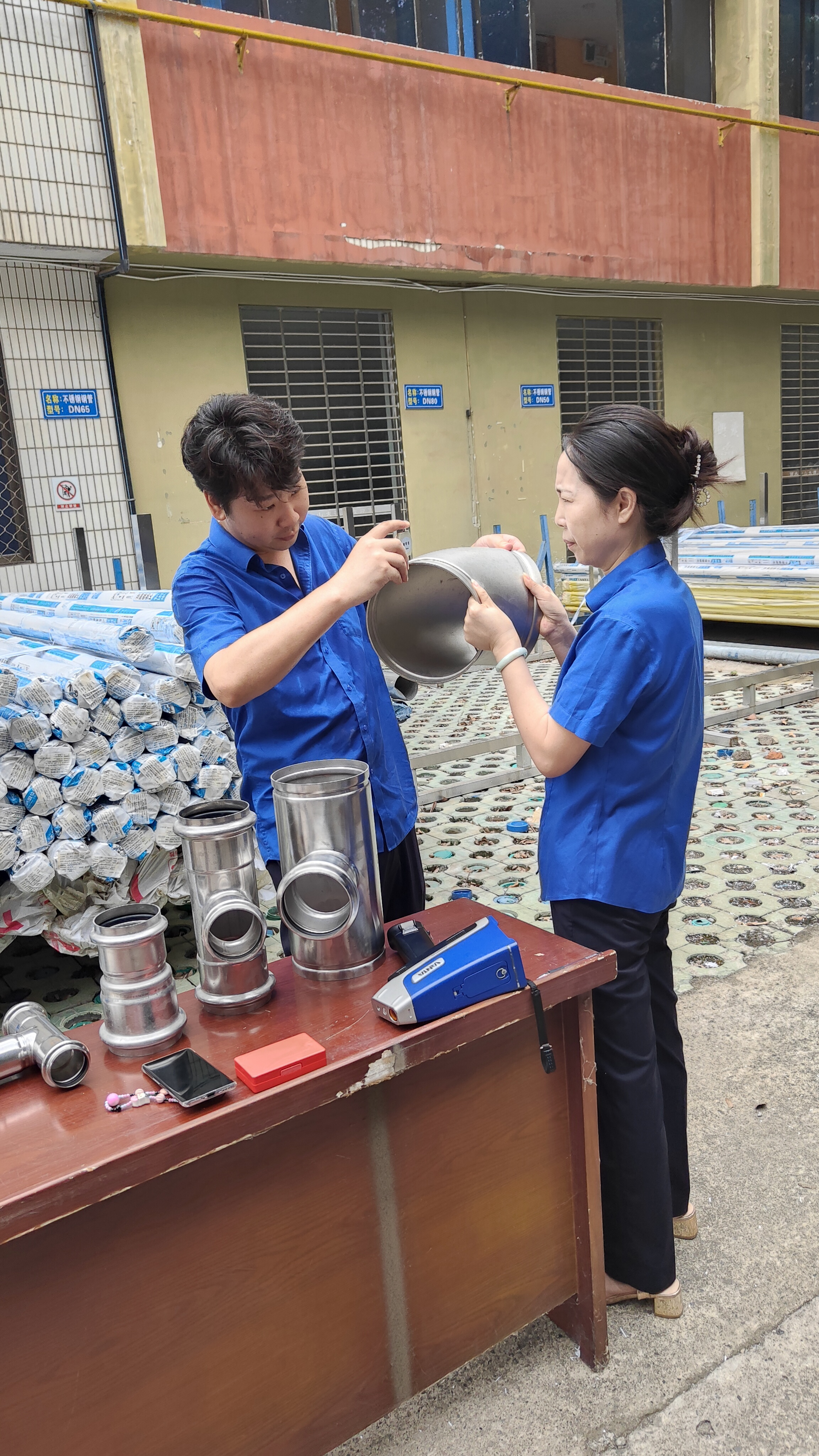 在實操比武環(huán)節(jié),參賽人員按流程對各類型號管件進行鑒別與檢驗:運用手持光譜儀檢測不銹鋼材質(zhì)成分,確認是否符合不銹鋼304標(biāo)準(zhǔn);使用測厚儀測量管件壁厚,嚴格把控尺寸偏差;用卷尺測量長度,核對與標(biāo)準(zhǔn)值的誤差。整個比武過程規(guī)范有序,參賽人員嚴謹操作,展現(xiàn)了扎實的驗質(zhì)功底。