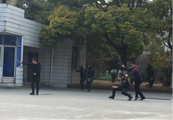 本次演練以在全國(guó)“兩會(huì)”召開(kāi)前夕,2名暴恐份子密謀在市供水總公司三水廠采取投毒方式實(shí)施暴恐襲擊為背景展開(kāi)。市公安局指揮中心接到水廠員工報(bào)案,2名暴恐份子駕車(chē)攜帶劇毒氰化物和匕首來(lái)到三水廠,密謀投毒、傷人。市公安局指揮中心立即派轄區(qū)派出所和巡邏組前往處置。在投毒失敗后,嫌疑人刺傷安保人員并挾持人質(zhì),與民警對(duì)峙。隨后,市公安局迅速啟動(dòng)反恐防范一級(jí)響應(yīng),調(diào)派轄區(qū)分局、巡特警、刑偵、交警等部門(mén)趕赴現(xiàn)場(chǎng)開(kāi)展工作。短短3分鐘,暴徒迅速被控制,其中有一名暴徒被當(dāng)場(chǎng)擊斃,人質(zhì)被成功解救。之后,120急救中心趕往現(xiàn)場(chǎng)救治,同時(shí)環(huán)境監(jiān)測(cè)部門(mén)迅速開(kāi)展水質(zhì)檢測(cè)評(píng)估,確保水廠供水安全。至此,反恐防暴演練活動(dòng)順利結(jié)束。