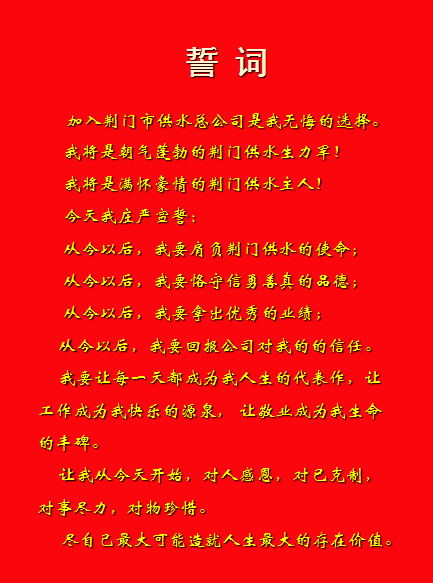 為進(jìn)一步激發(fā)供水人做好本職工作的榮譽(yù)感、使命感和責(zé)任感,11月9日下午,市供水總公司在五樓會(huì)議室首次舉行新進(jìn)員工入職宣誓儀式,讓他們用誓言表達(dá)對企業(yè)、對供水職業(yè)的忠誠。