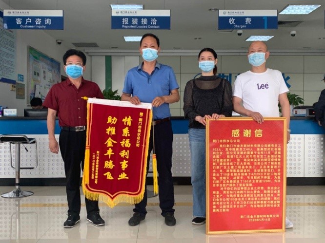 5月15日上午,荊門市金豐新材料有限公司總經(jīng)理袁家群和東寶區(qū)工商聯(lián)相關(guān)負(fù)責(zé)人來到市供水總公司,送上感謝信和寫有“情系福利事業(yè) 助推金豐騰飛”的鮮艷錦旗,以感謝市供水總公司想企業(yè)之所想、急企業(yè)之所急,用實(shí)際行動踐行初心使命,助推企業(yè)復(fù)工復(fù)產(chǎn)。
